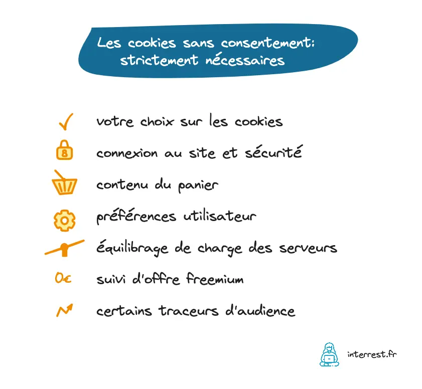 Il reste également les cookies propriétaires, envoyés par le site lui-même pour son fonctionnement. Dans ce cas, certains cookies sont exemptés de contentement. La CNIL nous propose une liste de ceux-ci.